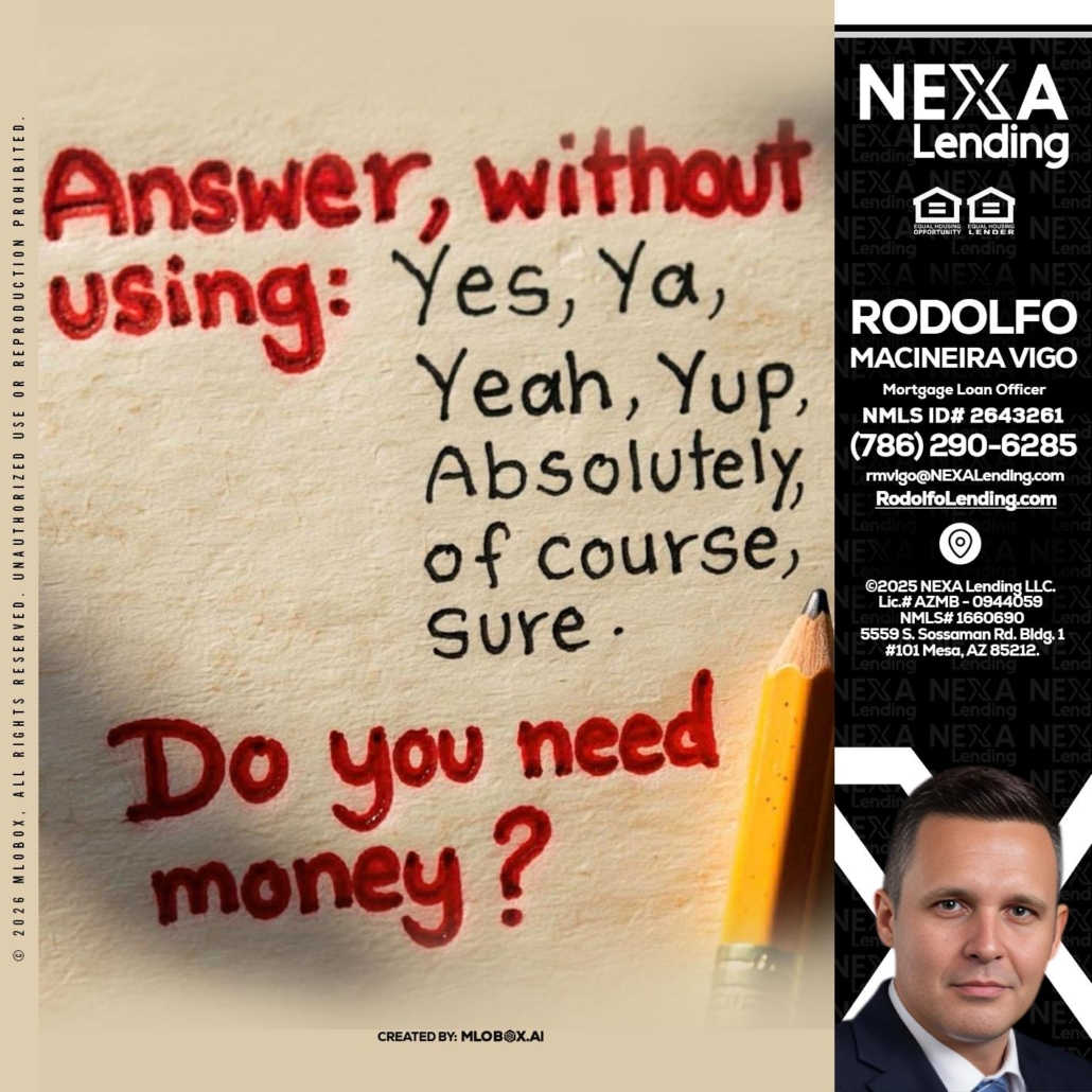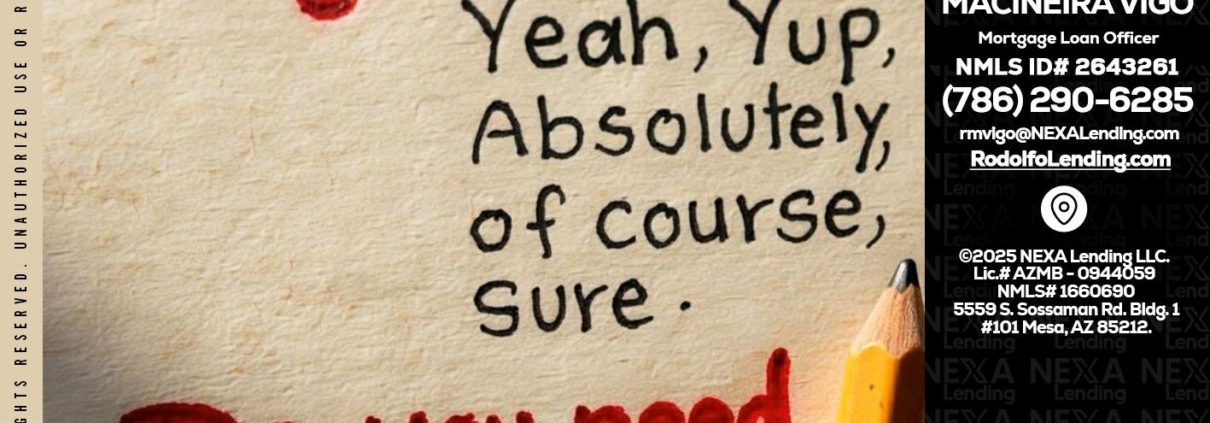 answer without - Rodolfo Macineira Vigo -Mortgage Loan OfficerHi, my name is Rodolfo Macineira Vigo. I’m a Loan Officer with NEXA Lending LLC., offering personalized mortgage solutions, fast customized quotes, great rates and service with integrity.